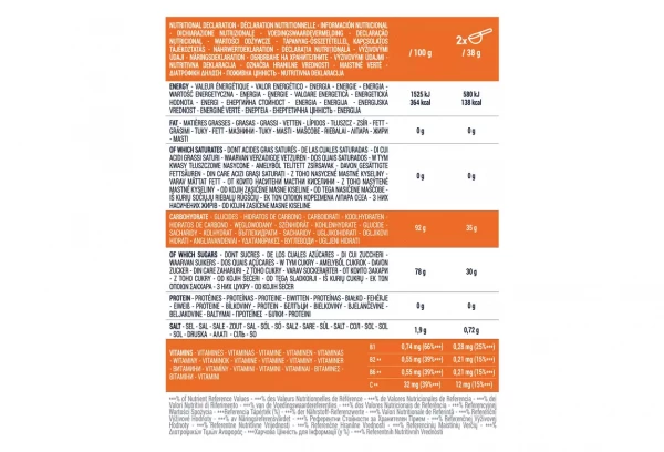 Préparation en poudre pour boisson sport isotonique, d’apport glucidique. Source de vitamines B1, B2, B6 et C, sodium. Goût Orange. Ingrédients : Saccharose (61%), dextrose (17%), maltodextrine (15%), acidifiant: acide citrique, citrate de sodium, chlorure de sodium, arôme naturel d’orange et autres arômes naturels, vitamines C, B2, B6, B1, colorant: betacarotene, denrée alimentaire colorante (concentré de carotte, hibiscus. Peut contenir des traces de : GLUTEN*, CRUSTACES*, OEUFS*, POISSONS*, SOJA*, LAIT*, CELERI*, SULFITES*, MOLLUSQUES*, LUPIN*, FRUITS A COQUE*. * Allergènes