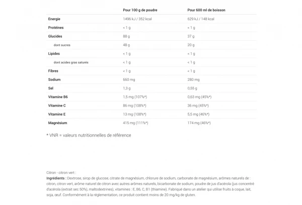 Dextrose, sirop de glucose déshydraté, phosphate tricalcique, carbonate de magnésium, chlorure de sodium, poudre de jus d’acérola (jus concentré d’acérola (extrait sec 50%), maltodextrine), arômes, gluconates de calcium et de zinc, vitamines C, B1 (thiamine) et B6. Fabriqué dans un atelier qui utilise : céréales contenant du gluten, fruits à coques, lait, soja.