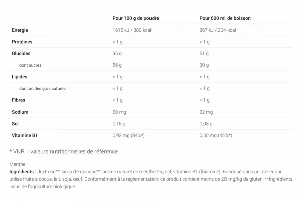 Dextrose*, sirop de glucose déshydraté*, arôme naturel de menthe 2%, poudre de jus d’acérola* (jus concentré d’acérola* (extrait sec 50%), maltodextrine*), sel, vitamine B1 (thiamine). Fabriqué dans un atelier qui utilise : céréales contenant du gluten, fruits à coques, lait, soja. *Ingrédients issus de l’agriculture biologique.