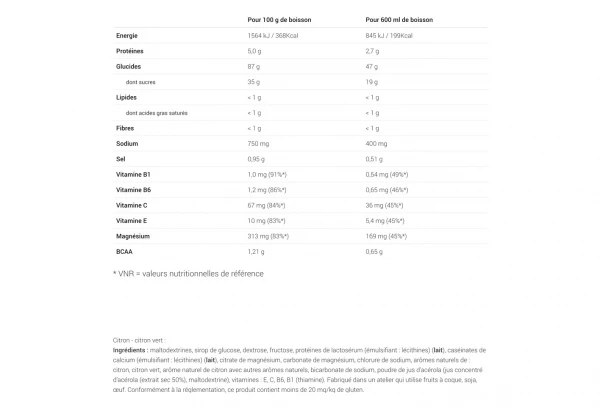 Maltodextrines, sirop de glucose déshydraté, dextrose, fructose, protéines de lactosérum (émulsifiant : lécithines) (lait), caséinates de calcium (émulsifiant : lécithines) (lait), arômes, phosphates de calcium, carbonate de magnésium, chlorure de sodium, poudre de jus d’acérola (jus concentré d’acérola (extrait sec 50%), maltodextrine), gluconates de calcium et de zinc, vitamines C, B1 (thiamine) et B6. Fabriqué dans un atelier qui utilise : céréales contenant du gluten, fruits à coques, soja.