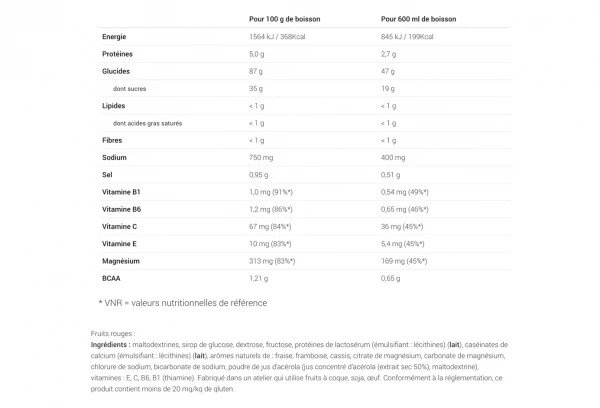 Maltodextrines, sirop de glucose déshydraté, dextrose, fructose, protéines de lactosérum (émulsifiant : lécithines) (lait), caséinates de calcium (émulsifiant : lécithines) (lait), arôme, phosphates de calcium, carbonate de magnésium, chlorure de sodium, poudre de jus d’acérola (jus concentré d’acérola (extrait sec 50%), maltodextrine), gluconates de calcium et de zinc, vitamines C, B1 (thiamine) et B6. Fabriqué dans un atelier qui utilise : céréales contenant du gluten, fruits à coques, soja.