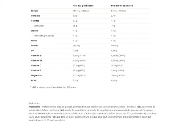 Maltodextrines, sirop de glucose déshydraté, dextrose, fructose, protéines de lactosérum (émulsifiant : lécithines) (lait), caséinates de calcium (émulsifiant : lécithines) (lait), arômes, phosphates de calcium, carbonate de magnésium, chlorure de sodium, poudre de jus d’acérola (jus concentré d’acérola (extrait sec 50%), maltodextrine), gluconates de calcium et de zinc, vitamines C, B1 (thiamine) et B6.