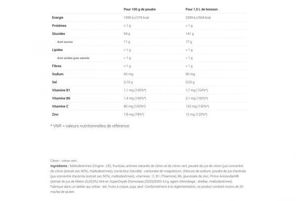 Maltodextrines, fructose, sirop de glucose déshydraté, phosphate tricalcique, carbonate de magnésium, jus de citron en poudre (jus concentré de citron (extrait sec 40%), maltodextrine), arômes, chlorure de sodium, poudre de jus d’acérola (jus concentré d’acérola (extrait sec 50%), maltodextrine), gluconates de calcium et de zinc, vitamines C, B1 (thiamine) et B6. Fabriqué dans un atelier qui utilise : céréales contenant du gluten, fruits à coques, lait, soja.