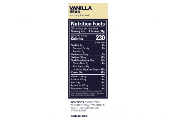 - 20g de whey protein (protéines de lactosérum) pour améliorer la synthèse de protéine et favoriser la régénération musculaire
