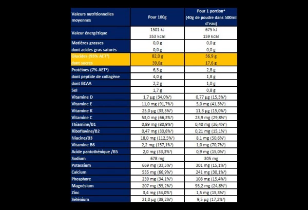 Ingrédients : Maltodextrine*, sucre*, dextrose*, minéraux (citrate de sodium, citrate de potassium, phosphate de calcium, citrate de magnésium, sulfate de zinc, sélénate de sodium), peptide de collagène hydrolysé, fructose, acides aminés branchés à chaine ramifiée (L-leucine, L-isoleucine, L-valine, émulsifiant : lécithine de tournesol), correcteur d’acidité : acide citrique, arôme naturel d’orange, vitamines (C, B3, E, B6, B5, B1, D3, K1, B2), colorants : béta-carotène, jus concentré de bettrave rouge en poudre. *ingrédients d’origine France.