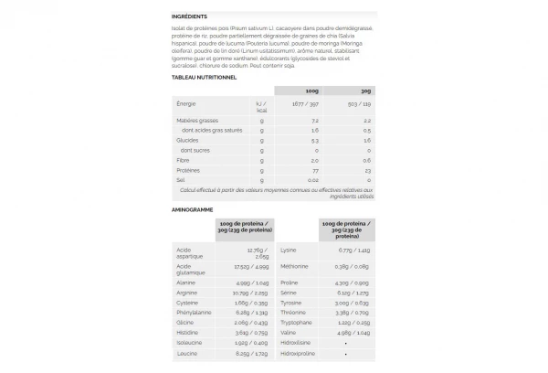 Il s’agit d’un produit apte pour les véganes, avec 70 % de protéines (21 g de protéines par ration). Avec à peine plus de 100 calories, faible en matières grasses et sans sucres ajoutés, car c’est la stévia qui lui donne son goût sucré. Son apport en sucre par ration est inférieur à 0,5 g. Il s’agit donc de l’aliment idéal à prendre à n’importe quel moment de la journée. Il permet d’augmenter la consommation de protéines végétales de manière saine.