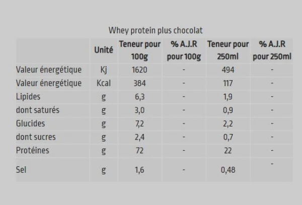 Obtenue grâce à des procédés technologiques avancés (diafiltration membranaire et ultrafiltration), la boisson Whey Protein, vous apporte des protéines de qualité qui contribuent à maintenir et augmenter la masse musculaire, mais aussi des acides aminés essentiels (EAA :45%) et des acides aminés branchés (BCAA : 22%).