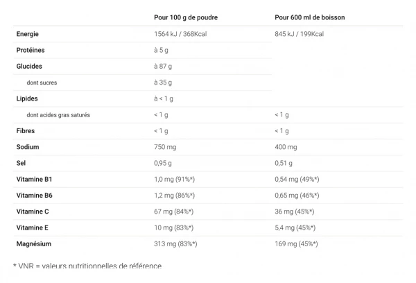 Ingrédients : maltodextrines, sirop de glucose, dextrose, fructose, protéines de lactosérum (émulsifiant : lécithines) (lait), caséinates de calcium (émulsifiant : lécithines) (lait), citrate de magnésium, carbonate de magnésium, chlorure de sodium, bicarbonate de sodium, poudre de jus d’acérola (jus concentré d’acérola (extrait sec 50%), maltodextrine), arôme naturel de menthe (pour la saveur menthe), arôme naturel de pêche, thé noir instantané en poudre 0,2% (pour la saveur thé pêche), arômes naturels de : fraise, framboise, cassis (pour la saveur fruits rouges), arôme naturel de fruit de la passion, poudre de mangue 1% (mangue 64%, amidon de maïs, émulsifiant : lécithines), arôme naturel mangue (pour la saveur passion mangue), arômes naturels de : citron, citron vert, arôme naturel de citron avec autres arômes naturels (pour la saveur citron-citron vert), arômes naturels de : citron, citron vert, pamplemousse, orange (pour la saveur cocktail d’agrumes), vitamines : E, C, B6, B1 (thiamine). Fabriqué dans un atelier qui utilise fruits à coque, soja, œuf, céleri, sulfites. Conformément à la réglementation, ce produit contient moins de 20 mg/kg de gluten.